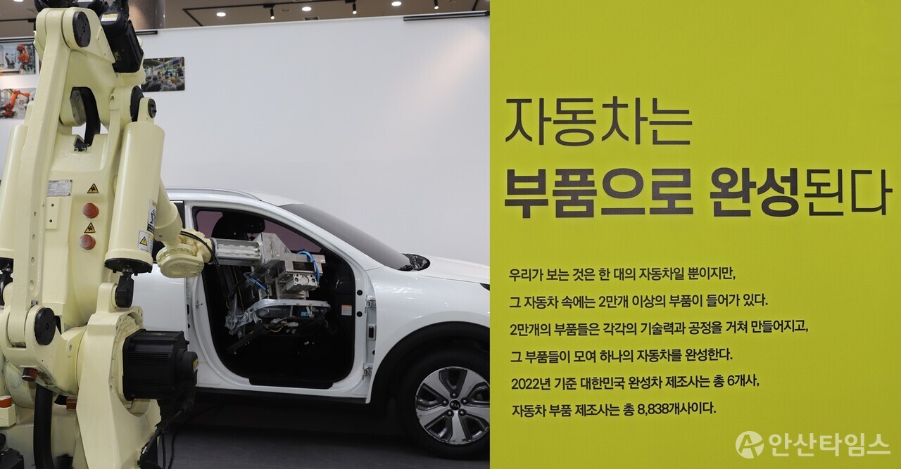 로비에 산업용 로봇 HX165가 자동차 시트를 조립하는 모습과 2만 개 이상의 부품이 모여 자동차가 만들어지는 과정을 돌아보면 안산산업단지의 자동차 부품 기업들이 우리나라 자동차산업을 이끌어가는 주역임을 느낄 수 있다.