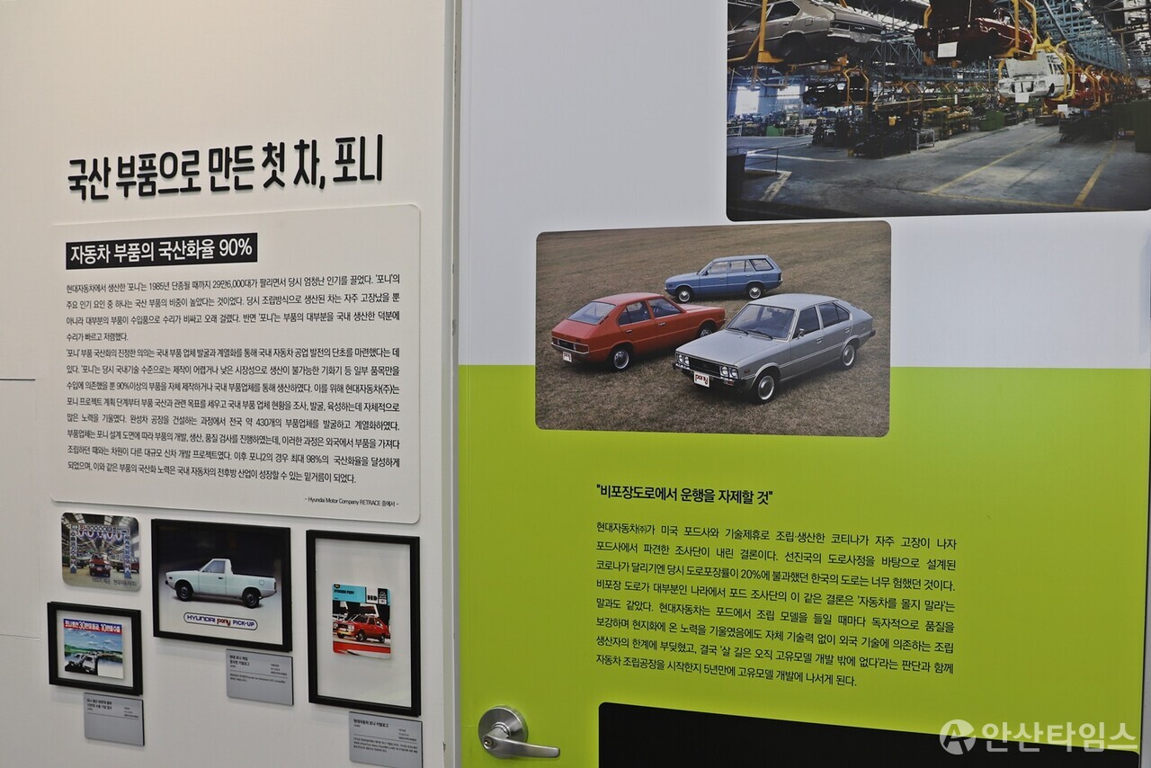 1층 전시실에는 대한민국 자동차의 역사를 한눈에 볼 수 있는 ‘순종황제 어차’를 비롯해 ‘시-바ㄹ자동차’, ‘신진자동차’, ‘포니2 픽업’ 등의 자료와 실물이 전시되어 있다.