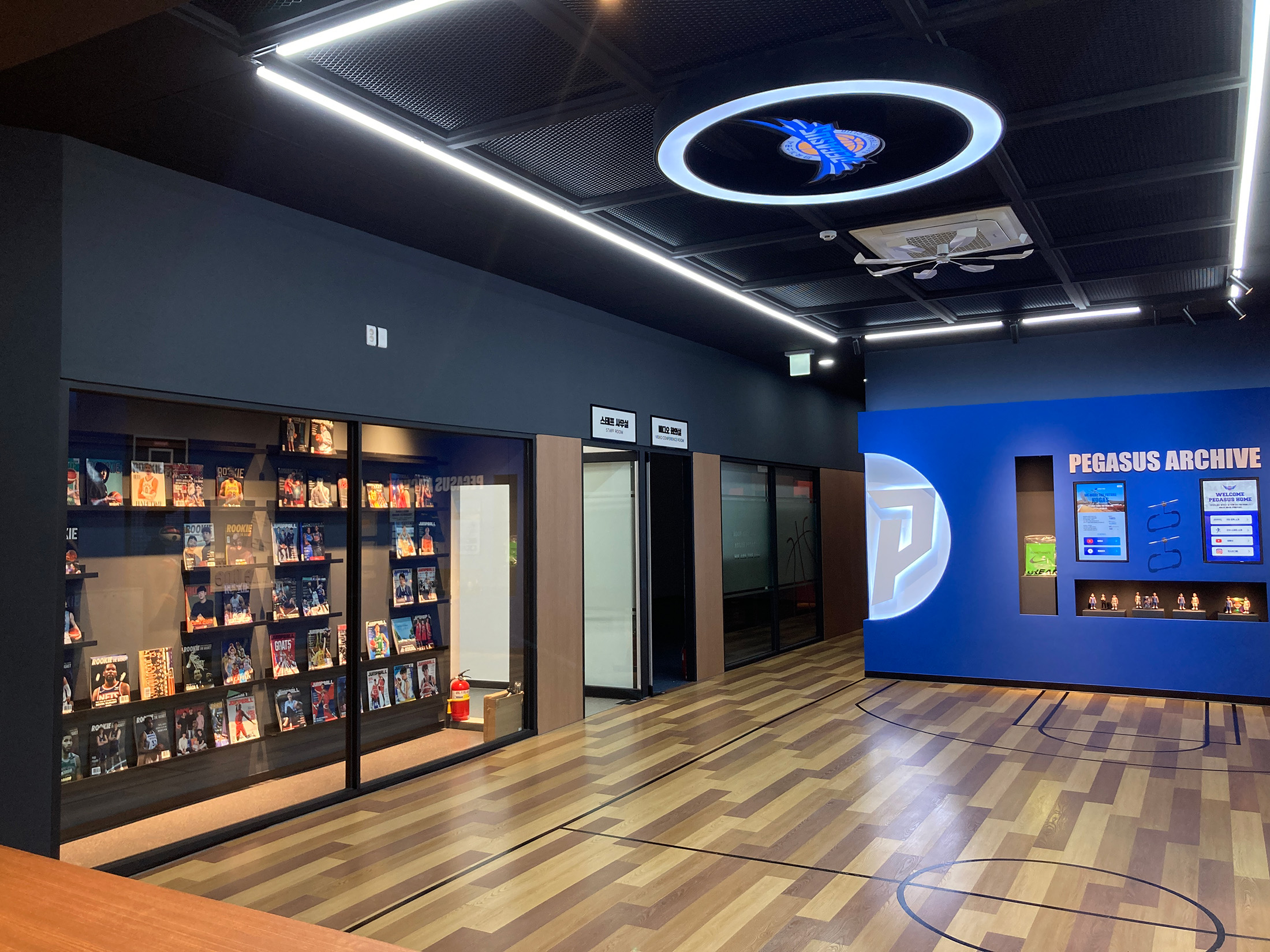 한국가스공사 페가수스 프로농구단의 구단 사무실은 아카이브존, 전력분석실, 감독실, 스태프 사무실 및 부속실 등으로 구성되어있다. 사무실 전반에는 한국가스공사와 프로농구단의 상징 로고와 색상을 적용하고, 차분한 톤의 인테리어로 집중도와 안정감을 동시에 갖춘 공간으로 연출했다.