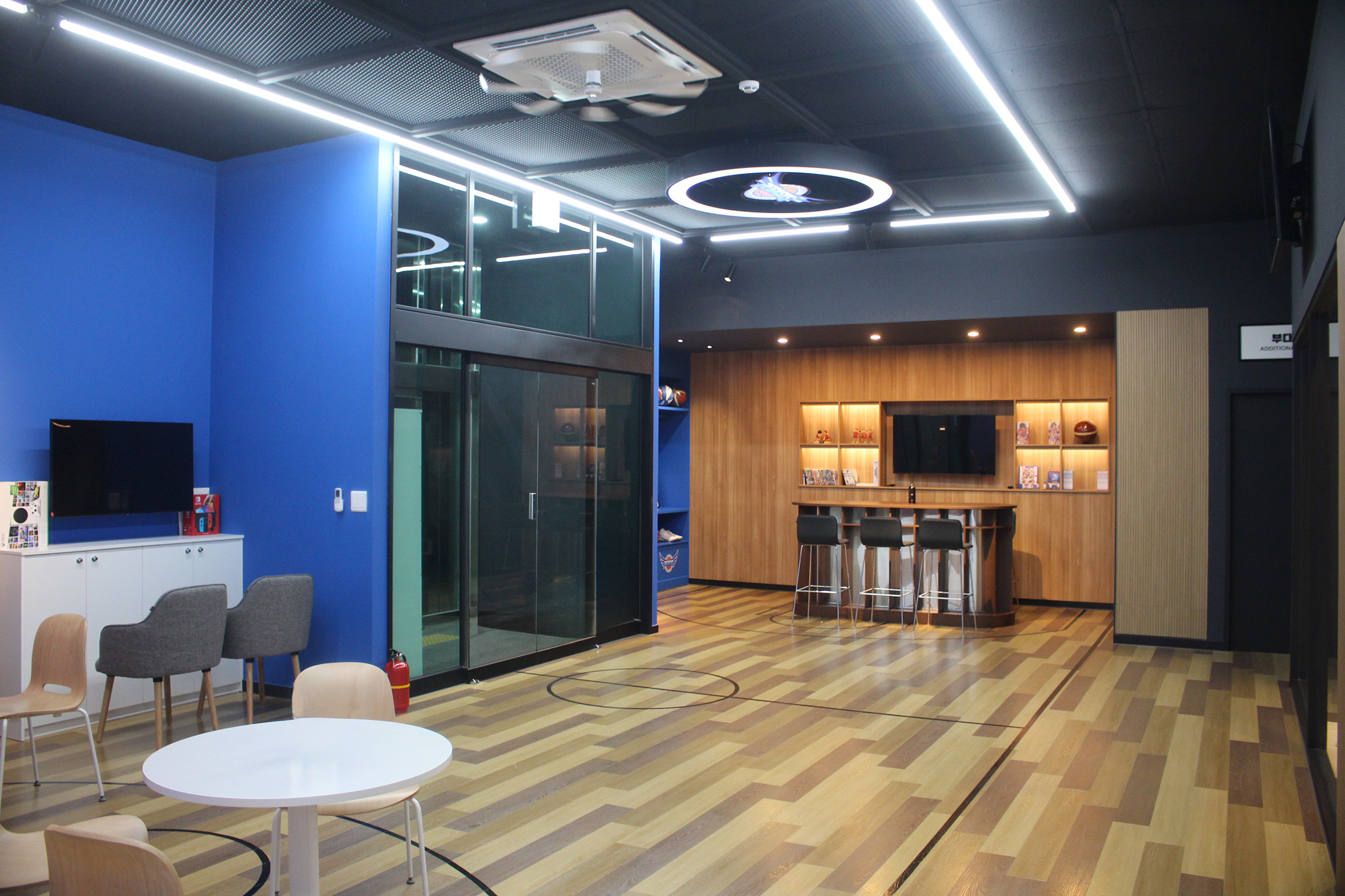 The club office of the Korea Gas Corporation Pegasus professional basketball team is composed of an archive zone, a performance analysis room, the head coach’s office, staff offices, and auxiliary spaces. Throughout the office, the symbolic logos and colors of Korea Gas Corporation and the professional basketball team are applied, and the space is designed with a calm interior tone that provides both focus and a sense of stability.